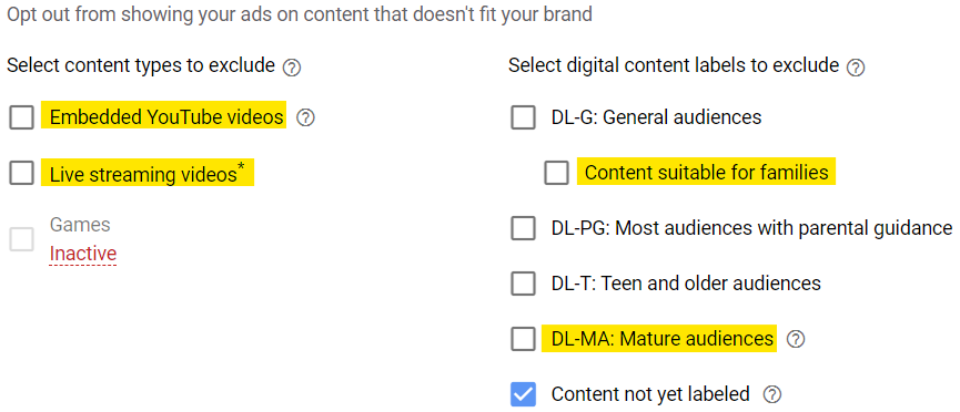 Select the content types and labels to exclude from your YouTube campaign.