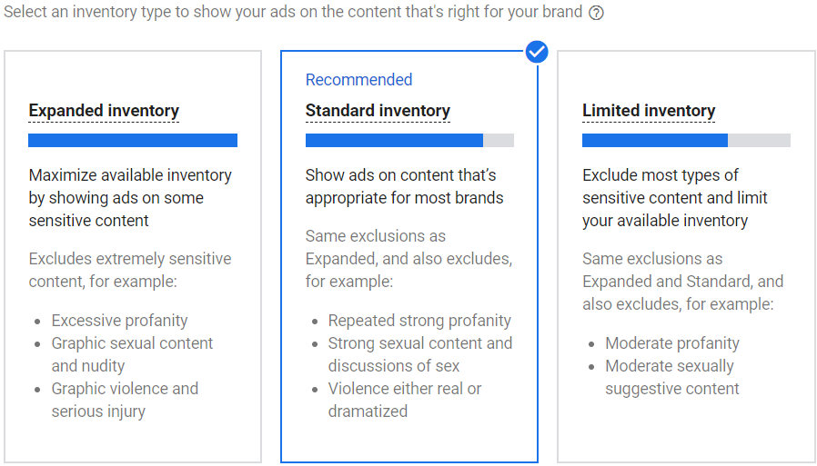For once, I don’t recommend to go for the conservative approach. Indeed if you select Limited inventory option, first you take the risk of increasing your CPM because of a smaller inventory availability, and second you take the risk of missing your target which consumes standard inventory (like “moderate profanity”, “moderate sexually suggestive behavior”) and increase the likelihood to show your ads to kids. You can go through all the details of what is included or excluded for each inventory type in the interface to make sure it fits your brand requirements, but I think most brands will be fine with Standard inventory selected.